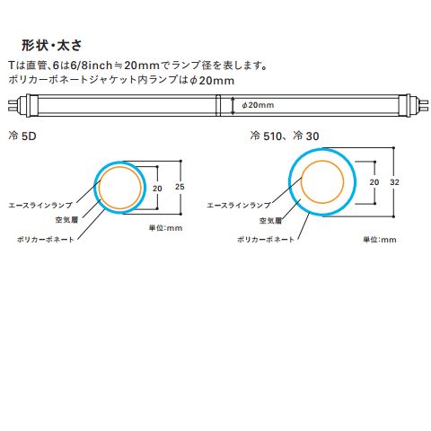 【仕様】●メーカー:DNライティング●型番:FLR1515T6EXDレイ5D●JANコード:4931586430324●種別:ラピッドスタート形蛍光ランプ●コールドケースランプ●冷5D●直管●光源色:3波長形昼光色●色温度:6700K●ランプ寸法:長さ1515mm×管径20mm●ジャケットの長さ:1445mm●取付全長:1559mm●ポリカーボネート径:25mm●使用可能温度範囲:-5℃〜10℃●適合安定器:MCD64U、MRD645(50Hz用)、MRD646(60Hz用)●適合安定器(高出力型):MCF64U●適合ソケット:PR66●適合ランプホルダー:25M、25V【ご注意】※冷風が直接当たる場所は避けてください。